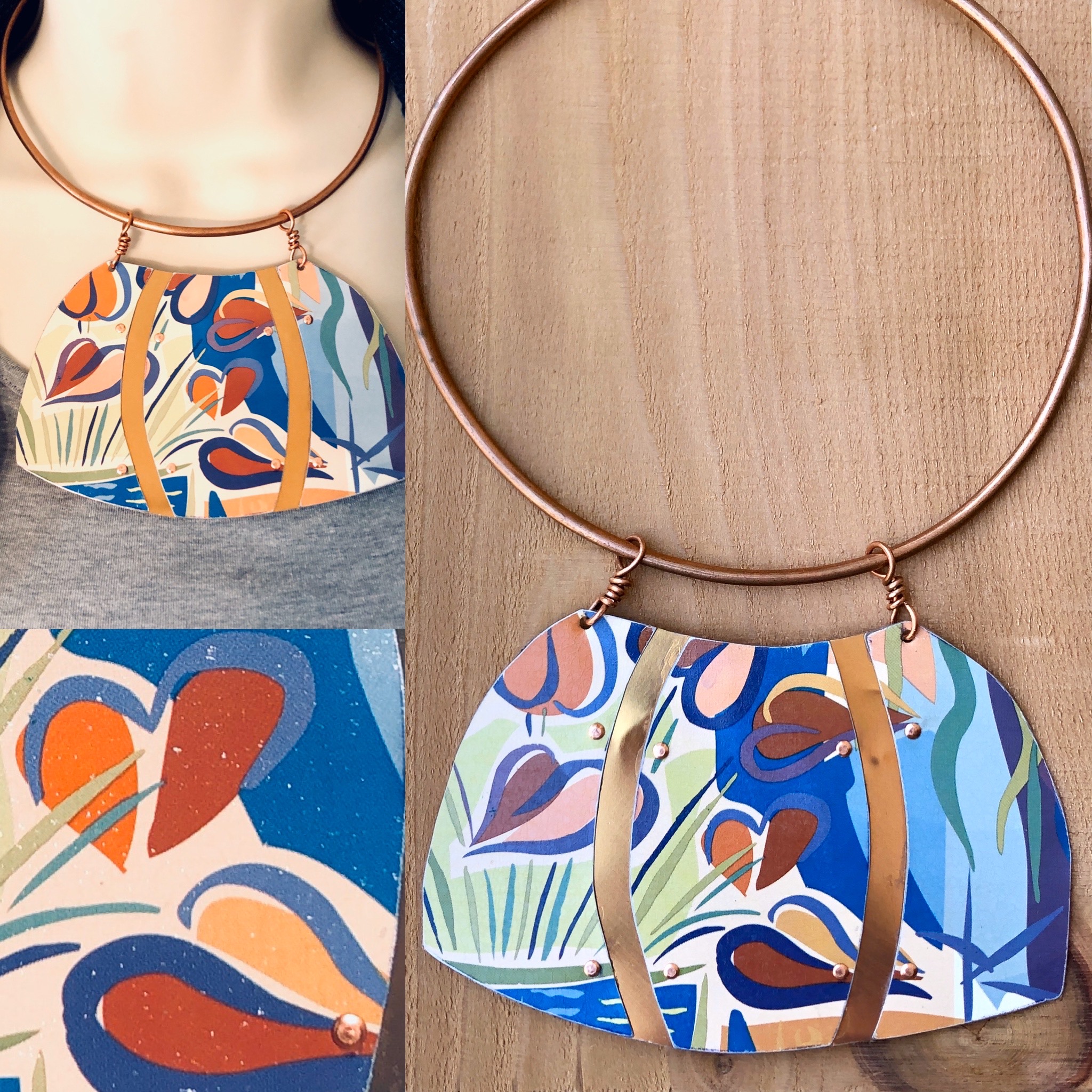 • Vintage Tin Necklace Tryptic Pop Art Floral Statement Collar