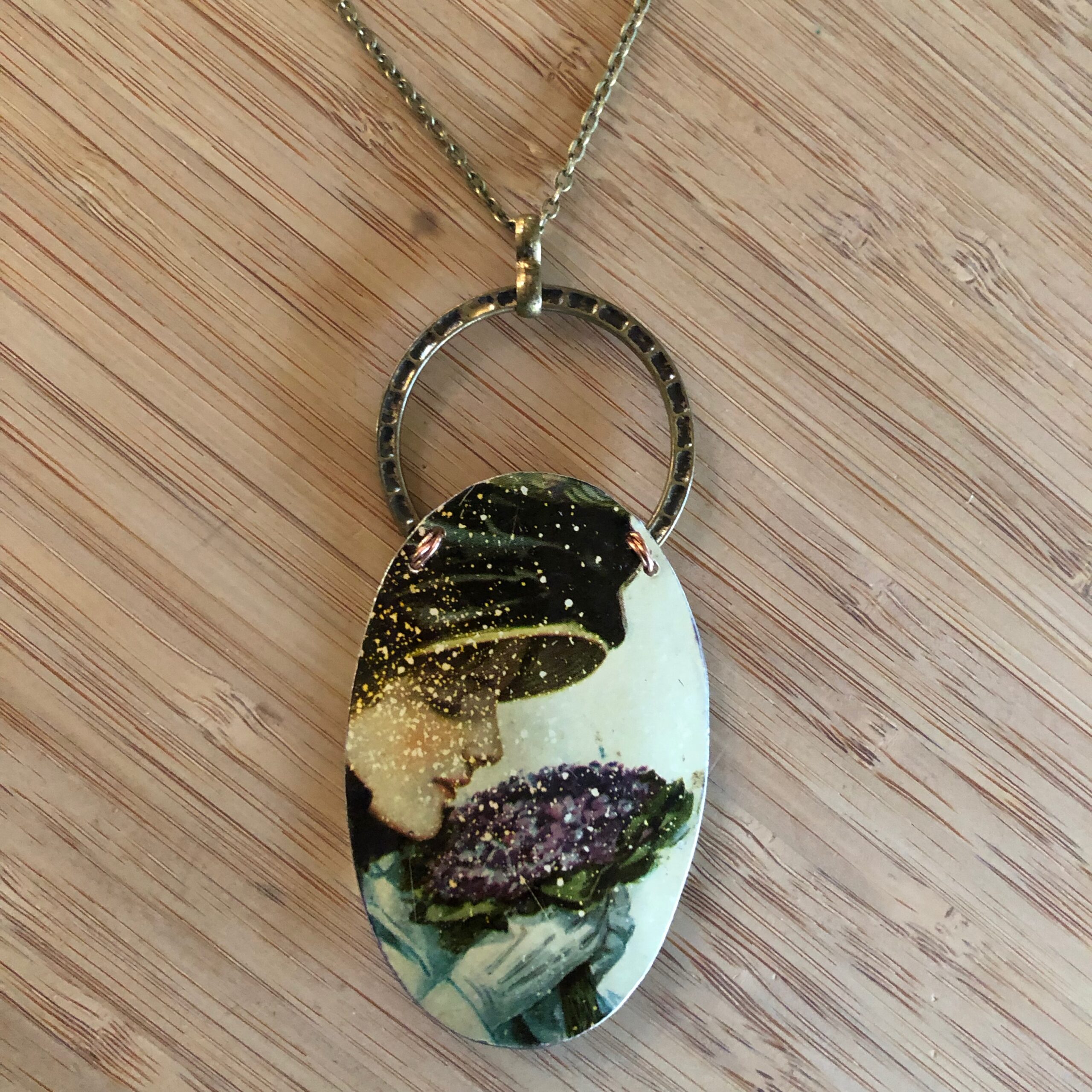 • Vintage Tin Necklace Victorian Lady with Violets Long Pendant