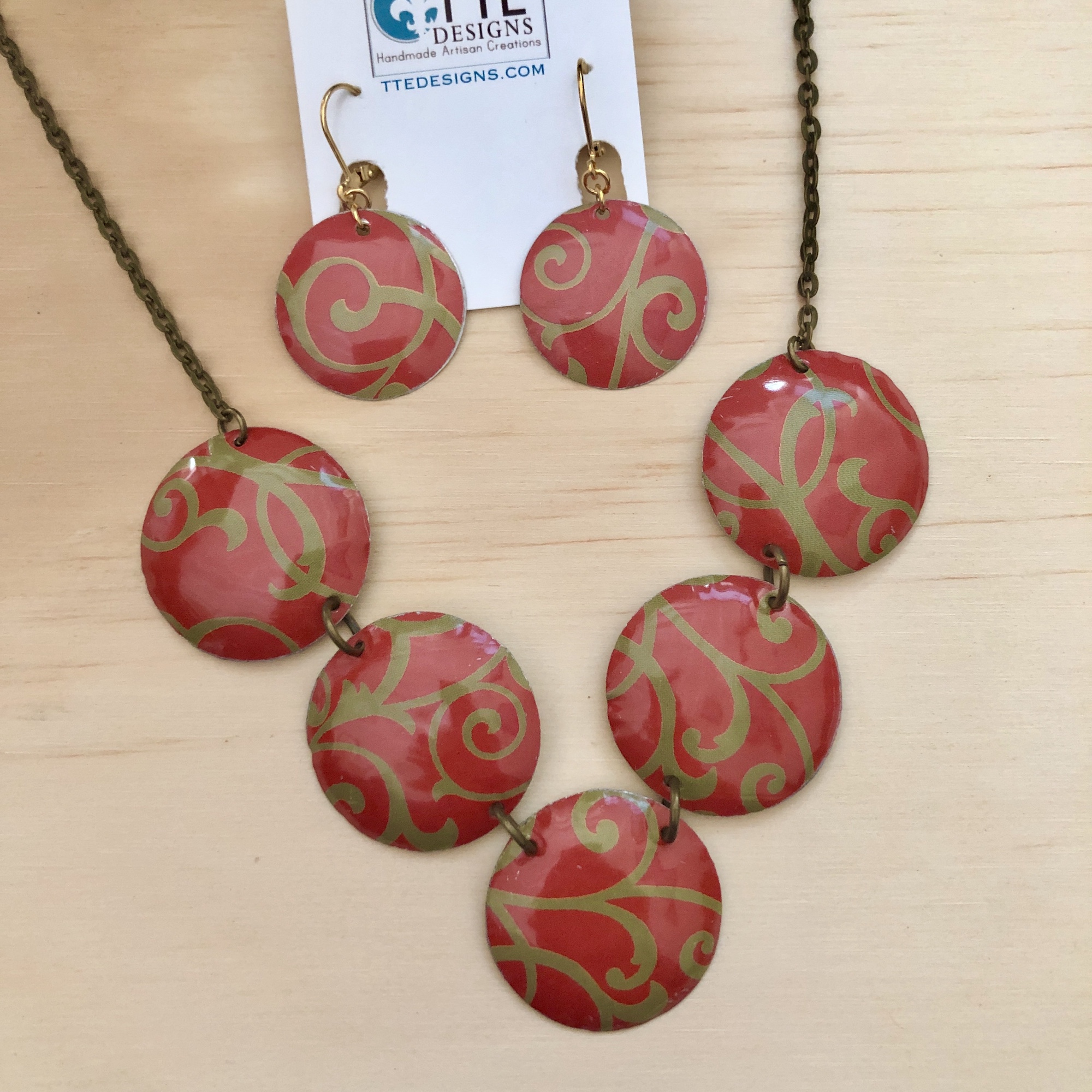 Rusty Red & Sage Green Arabesque Motif Vintage Tin Necklace and Earrings Set