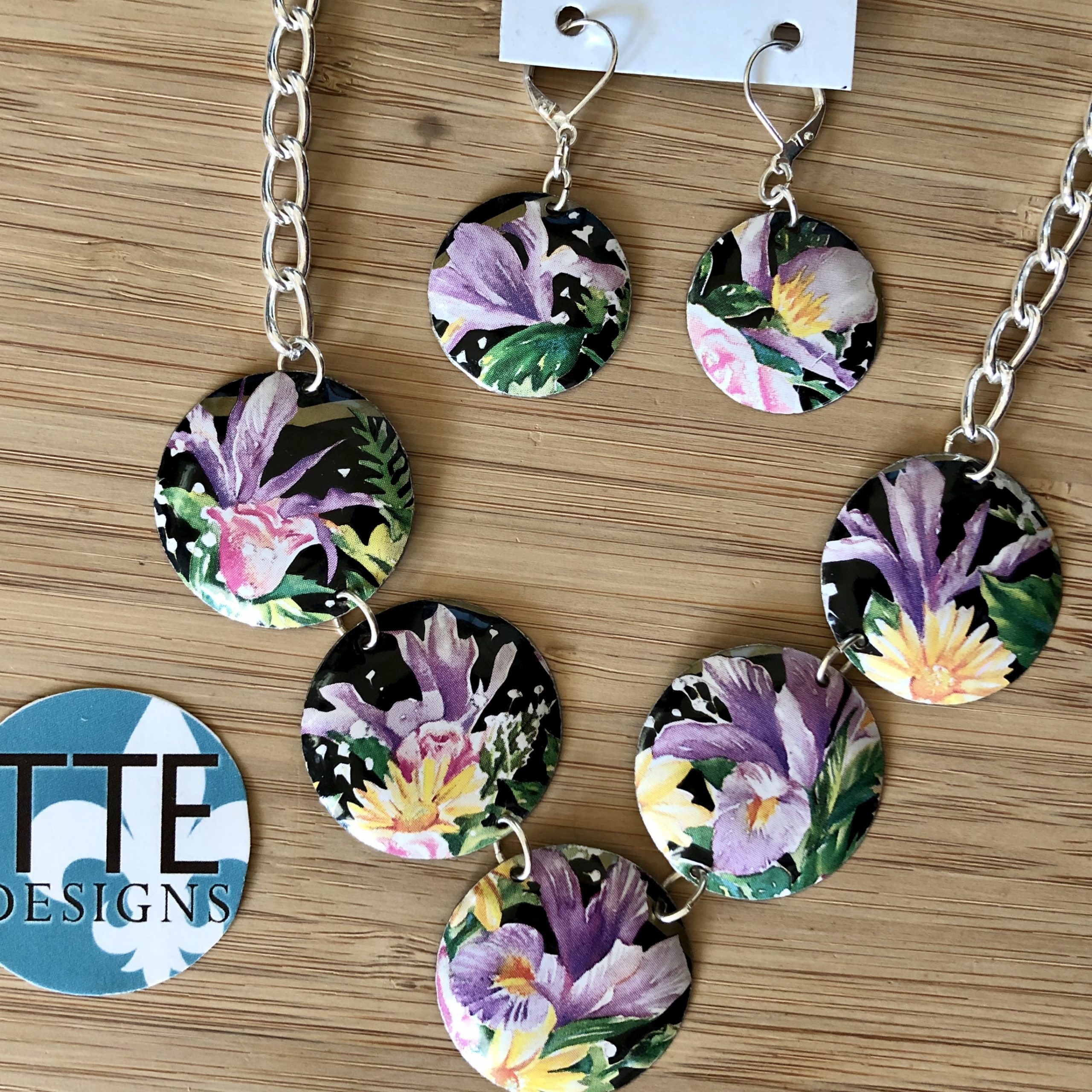 Vintage Tin Necklace Floral Purple Iris, Yellow Daisies, Pink Carnations Set