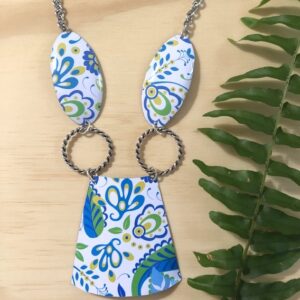 Created with ‘zero waste’ in mind, this eco-friendly, lightweight, durable and carefree vintage tin HEXAGON necklace will become your new cherished favorite. Handcrafted from a modern up-cycled steel tin container. Each piece is hand cut, filed, sanded and shaped to form a personal, one of a kind accessory. 18 inches long and finished with silver tone chain & toggle clasp.